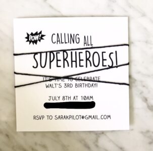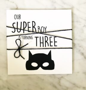 Walt had a birthday last week, and I am still trying to get over the fact that my once teenie baby is now THREE! This year is going to be the last year that I host a birthday party at home for him for awhile, so it was my last chance to go all out decorating my house with cute kids decor until Oliver gets older. Walt is obsessed with superheroes, particularly Batman, so I knew right away that would be the perfect theme. Utilizing Batman’s color scheme allowed me to keep the decor monochrome. We learned the hard way on his first birthday not to spend a ton of money on decor, as it rained the entire time and ruined everything! I was thrilled that we were blessed with great weather (minus the BLAZING heat that day with 100% humidity), but this time I was able to find all of his decorations, including invitations, shipped from my favorite new company in Austrailia for under $200!